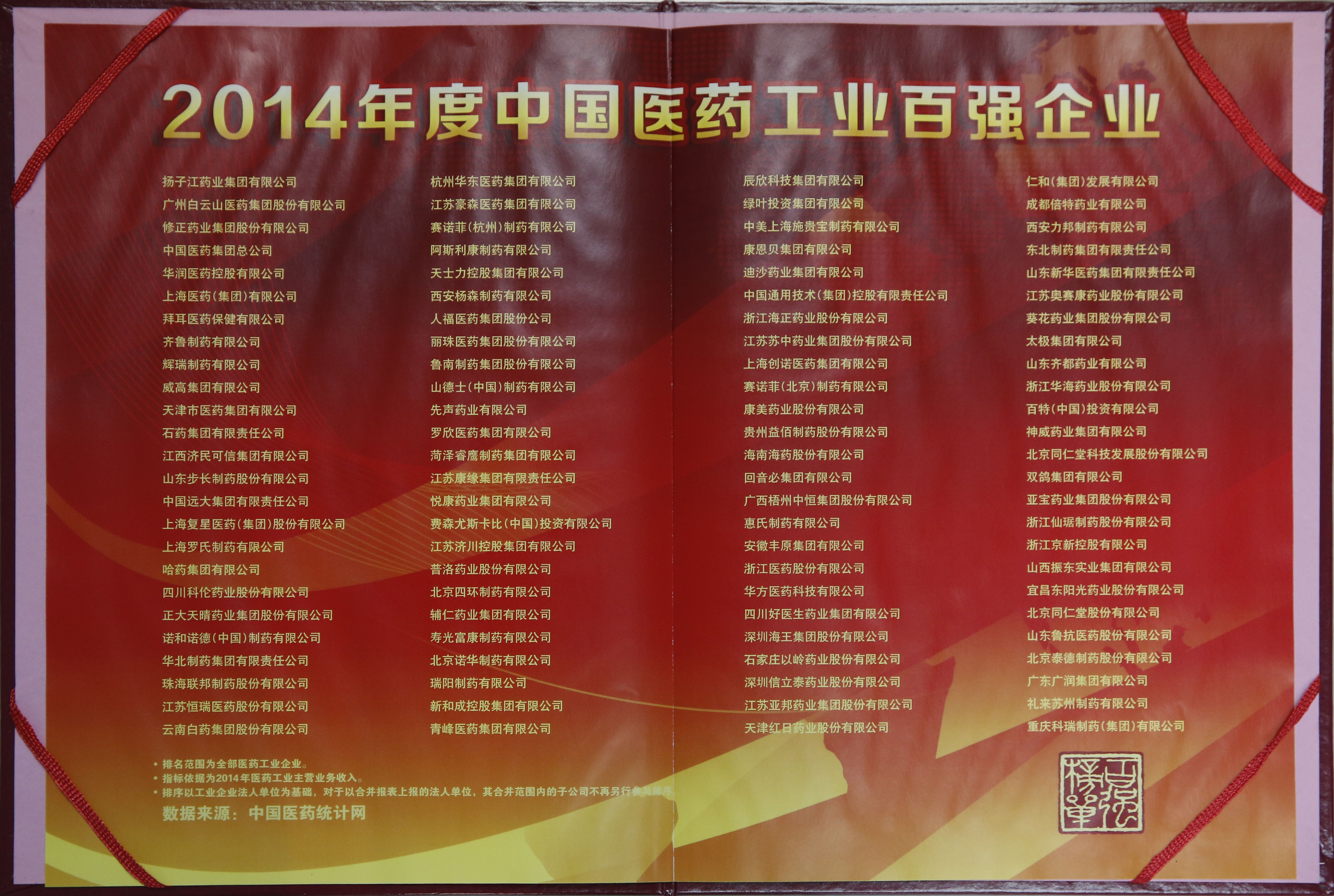 榮獲2014年度中國(guó)醫(yī)藥工業(yè)百?gòu)?qiáng)企業(yè)稱號(hào)