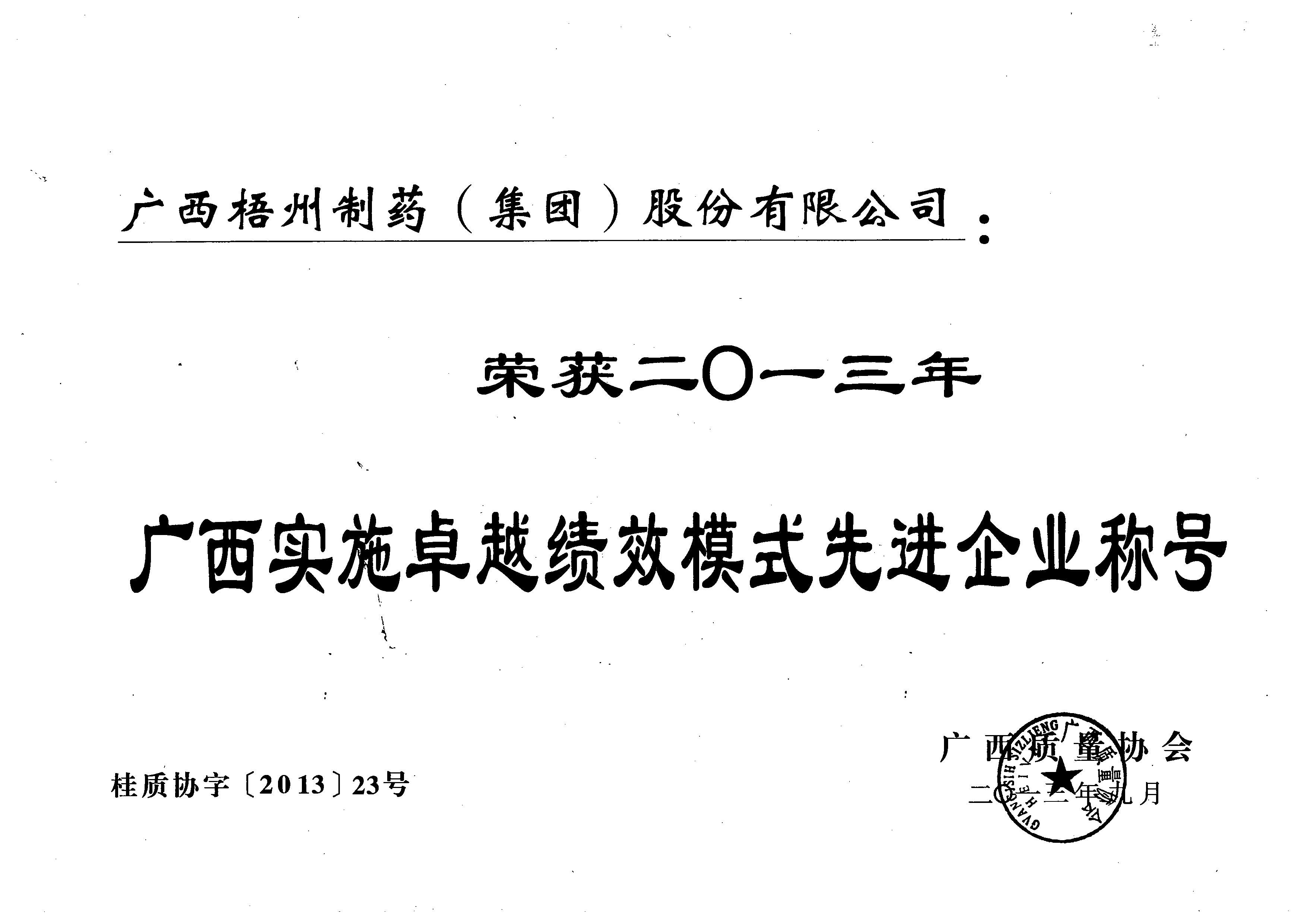 榮獲2013年廣西實(shí)施卓越績(jī)效模式先進(jìn)企業(yè)稱號(hào)
