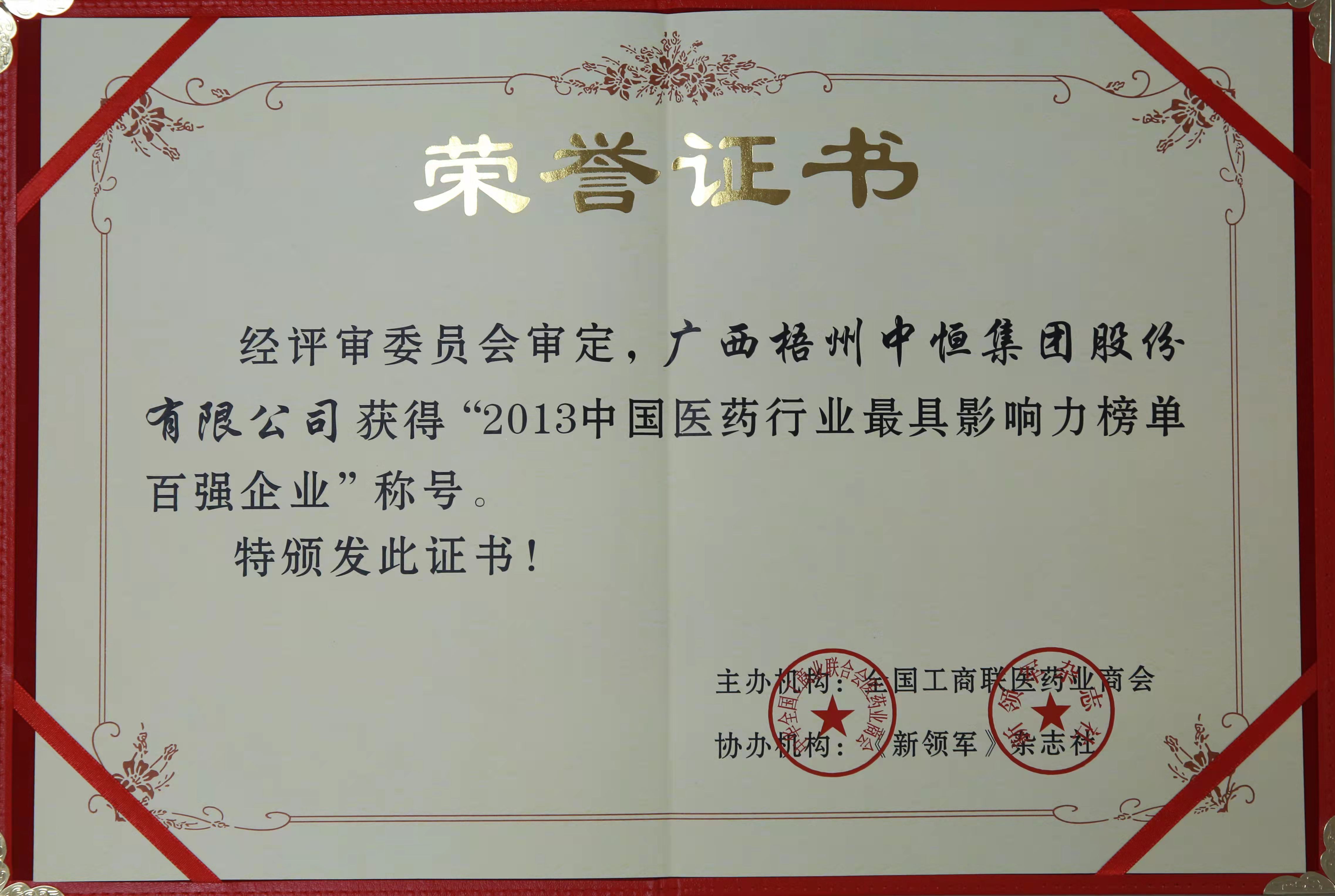 榮獲“2013年中國醫(yī)藥行業(yè)最具影響力百強企業(yè)”稱號