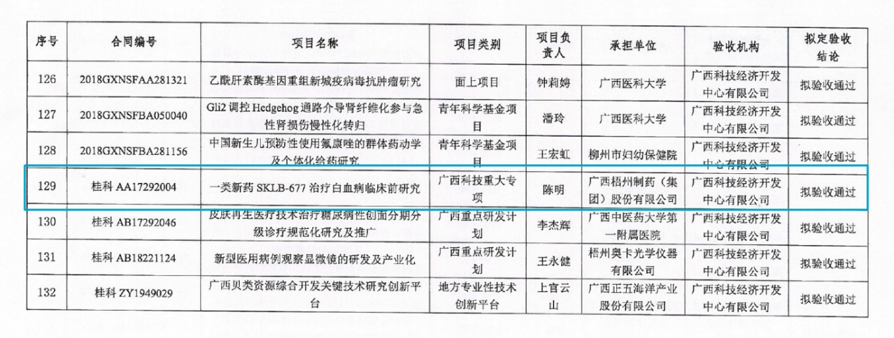 根據(jù)廣西科技項(xiàng)目評(píng)估中心發(fā)布的“廣西科技計(jì)劃項(xiàng)目擬定驗(yàn)收結(jié)論公示”(公示期:2022年7月22日—28日),中恒集團(tuán)梧州制藥承擔(dān)的廣西科技重大專項(xiàng)《一類新藥SKLB677治療白血病的臨床前研究》項(xiàng)目通過(guò)驗(yàn)收。