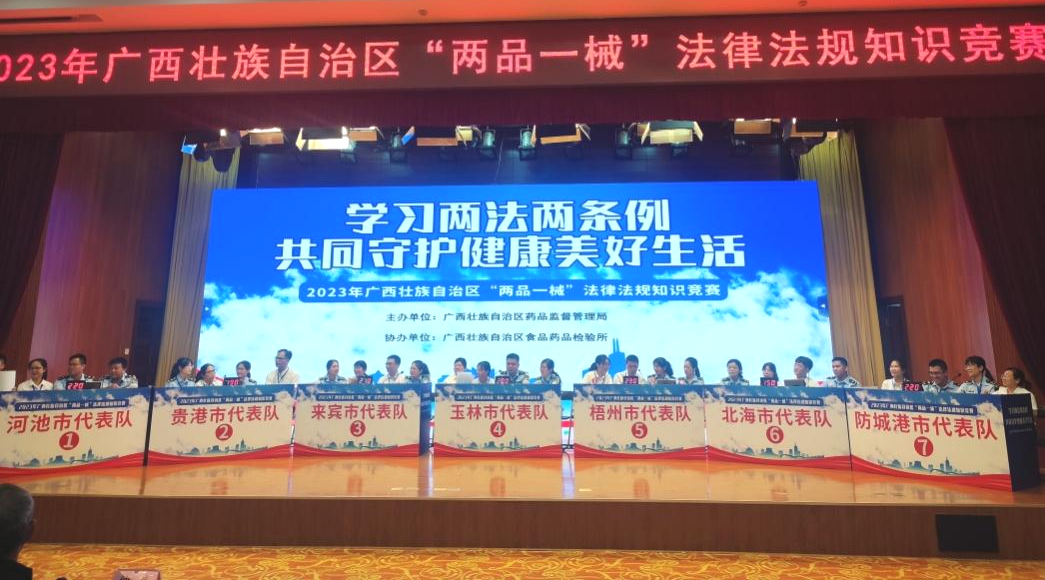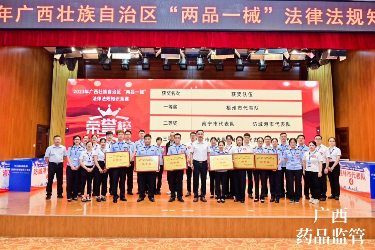 7月13日,由梧州制藥員工代表——質(zhì)量控制部呂金慧、質(zhì)量保證部李佳霖與梧州市場監(jiān)督管理局監(jiān)管人員組成的梧州市代表隊參加廣西壯族自治區(qū)“兩品一械”法律法規(guī)知識競賽,憑借過硬的專業(yè)知識、迅速的反應能力、高效的團隊配合力,與全區(qū)14個市代表隊展開激烈角逐,榮獲得2023年廣西壯族自治區(qū)“兩品一械”法律法規(guī)知識競賽一等獎。