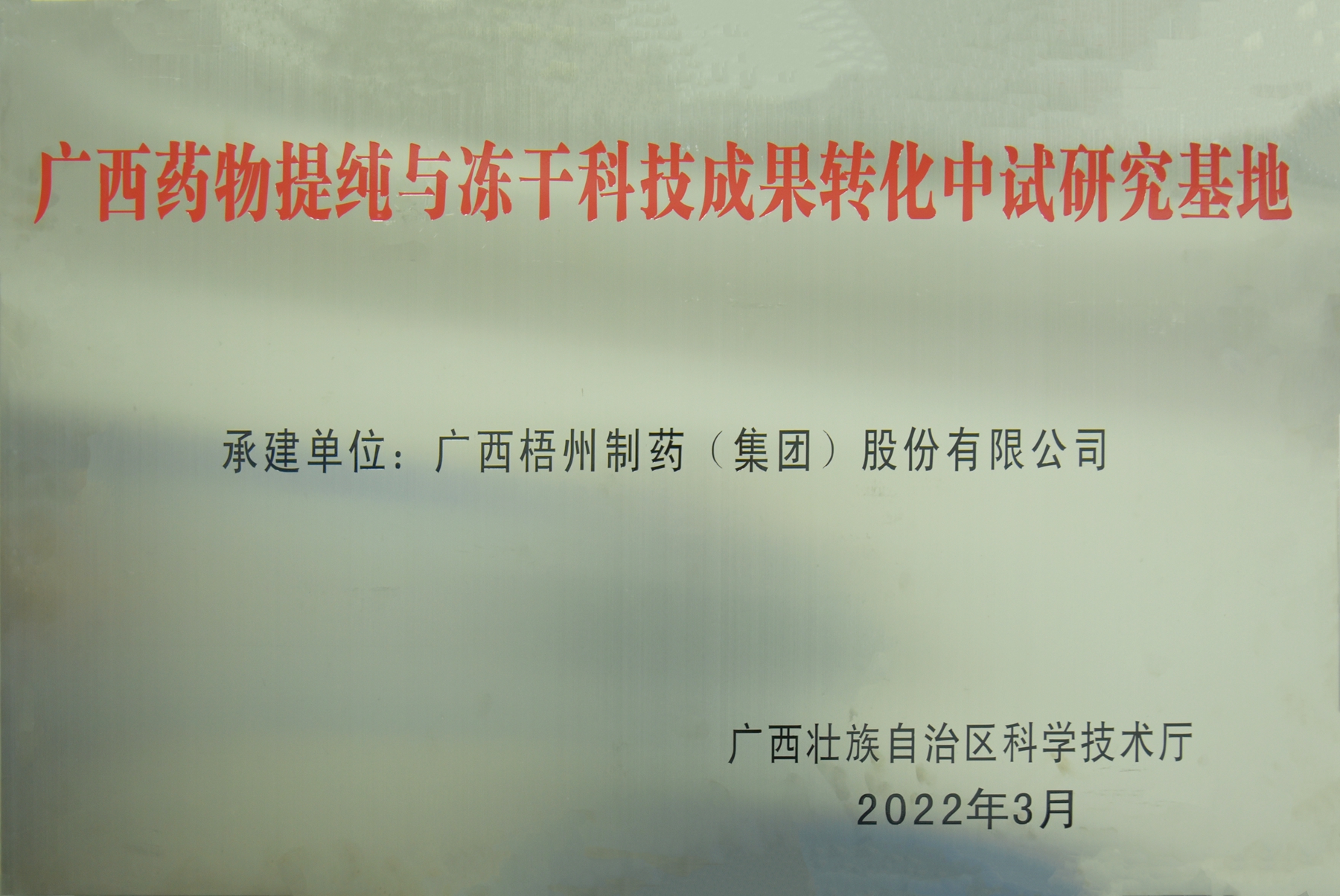 廣西梧州制藥(集團(tuán))股份有限公司評為廣西藥物提純與凍干成果轉(zhuǎn)化中試研究基地