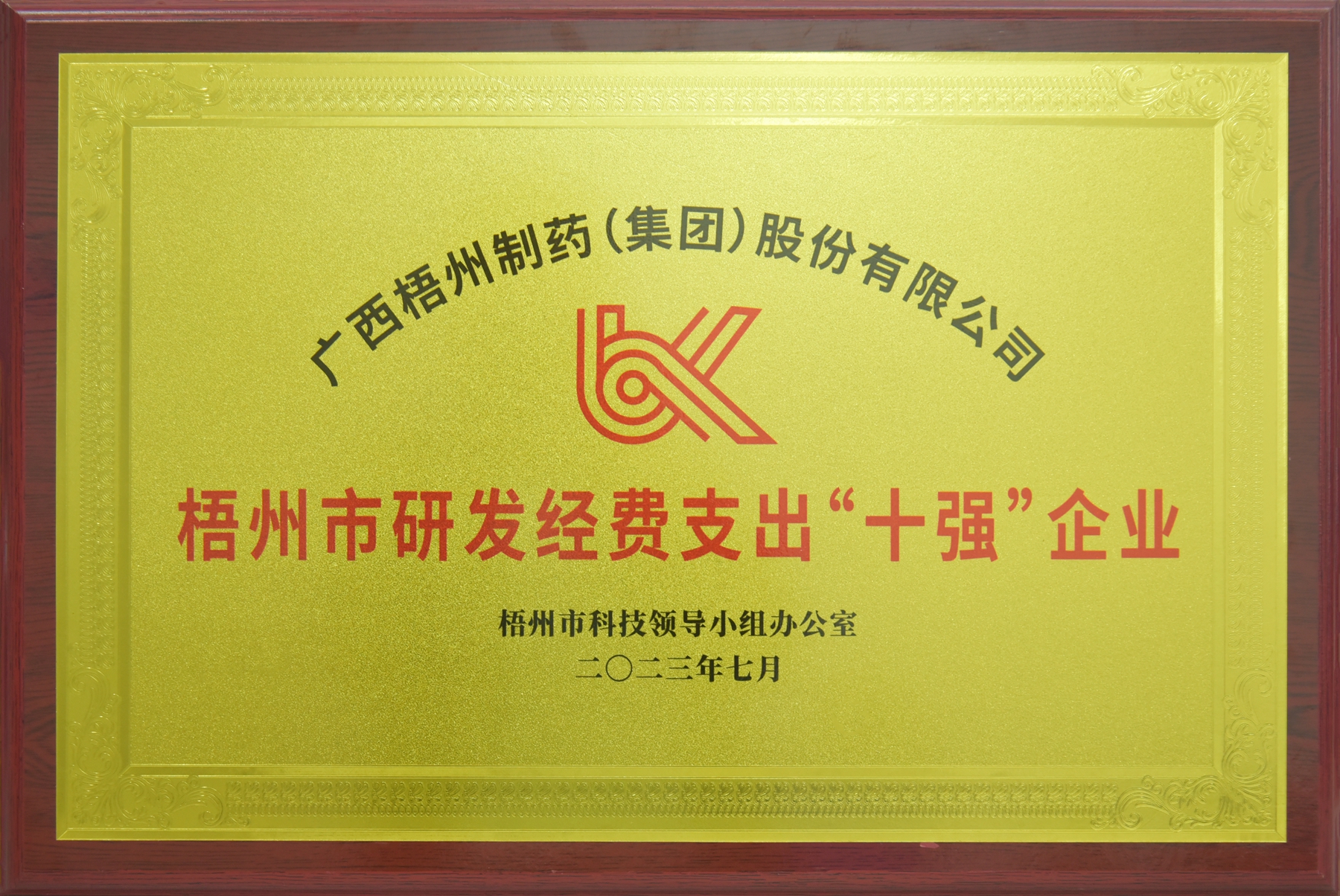 廣西梧州制藥(集團(tuán))股份有限公司獲評為梧州市研發(fā)經(jīng)費(fèi)支出“十強(qiáng)”企業(yè)