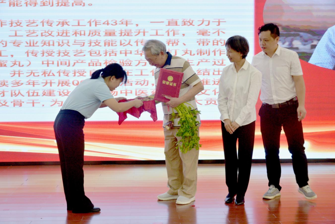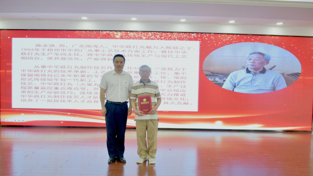 活動還專門邀請了中華跌打丸獻方人陳鐵的兒子,現(xiàn)已83歲高齡的原跌打丸生產(chǎn)車間主任陳永強到會,由公司黨委書記、董事長黃文彩為其頒發(fā)“中華跌打丸制作技藝——金牌師父”榮譽稱號?!爸腥A跌打丸制作技藝”的第三、第四、第五代非遺傳承人依次上臺,同樣用傳統(tǒng)的束脩六禮對陳老進行了謝師,以此來表達對師父的感激之情、教導(dǎo)之恩。