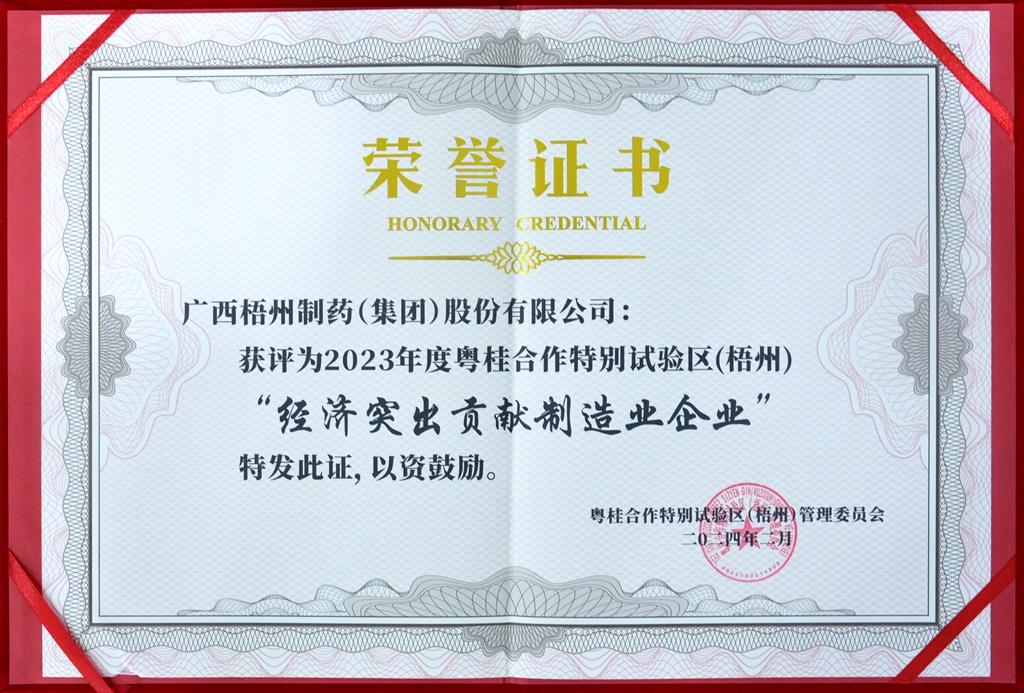 廣西梧州制藥(集團)股份有限公司獲評為2023年度粵桂合作特別試驗區(qū)(梧州)經濟突出貢獻制造業(yè)企業(yè)