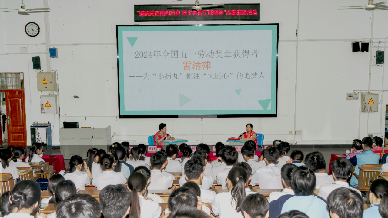 近日,在梧州市第一中學(xué),一場(chǎng)別開(kāi)生面的“巾幗勞模進(jìn)校園”開(kāi)講了,由中共梧州市委員會(huì)老干部局主辦的“銀齡同話(huà)梧州歷史 老少共傳工匠精神”志愿服務(wù)活動(dòng),梧州制藥固體車(chē)間工藝與技術(shù)主管雷潔萍受邀作為宣講代表出席活動(dòng)。