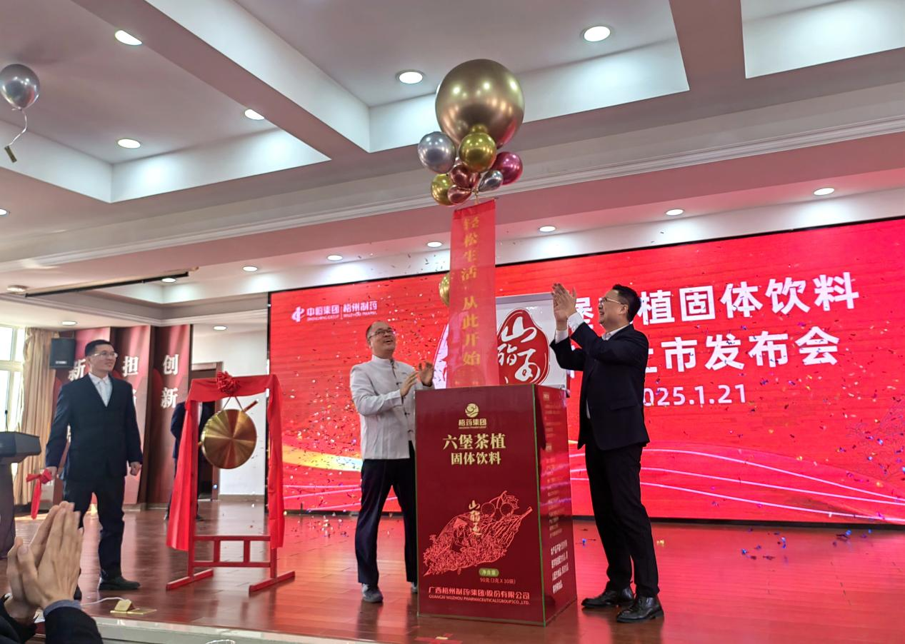 鑼聲嘹亮、氣球繽紛、掌聲熱烈。中恒集團(tuán)副總經(jīng)理肖淋、中恒集團(tuán)總經(jīng)理助理黃宇聲以及梧州制藥副董事長、總經(jīng)理劉洋共同啟動六堡茶植固體飲料新品上市發(fā)布儀式。