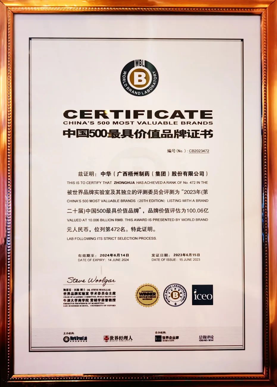 中華跌打丸為梧州制藥獨家生產(chǎn)品種,自1966年批準生產(chǎn)至今已經(jīng)臨床應用五十余年,先后收錄于2005版、2010版、2015版、2020版、2025版《中國藥典》,憑借其顯著的消腫止痛、舒筋活絡、止血生肌、活血祛瘀功效,在骨科治療領域深受認可。曾獲國家醫(yī)藥管理總局優(yōu)質(zhì)產(chǎn)品獎、中華人民共和國國家質(zhì)量獎銀獎等榮譽稱號,核心發(fā)明專利榮獲中國專利優(yōu)秀獎,廣西發(fā)明創(chuàng)造成果展覽獎。其產(chǎn)品商標是目前我國醫(yī)藥領域唯一一個獲準使用的“中華”商標,2023年“中華”品牌入選世界品牌實驗室發(fā)布的“中國500最具價值品牌”榜單,品牌價值評估超100億元,為當年度廣西唯一入選該榜單的醫(yī)藥品牌。