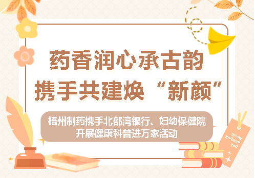 梧州制藥攜手北部灣銀行、婦幼保健院開展健康科普進萬家活動藥香潤心承古韻 攜手共建煥“新顏”7月19日上午,梧州制藥聯(lián)合廣西北部灣銀行梧州分行營業(yè)部、梧州市婦幼保健院,在北部灣銀行大廳舉辦“中醫(yī)文化潤心