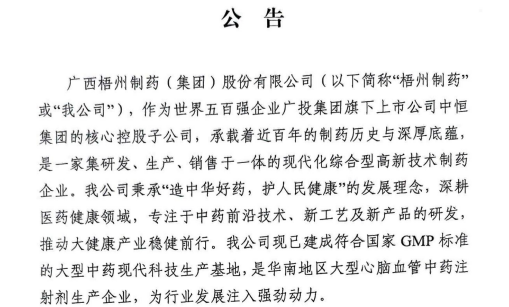 廣西梧州制藥(集團)股份有限公司招選公告廣西梧州制藥(集團)股份有限公司(以下簡稱“梧州制藥”或“我公司”),作為世界五百強企業(yè)廣投集團旗下上市公司中恒集團的核心控股子公司,承載著近百年的制藥歷史與深厚底