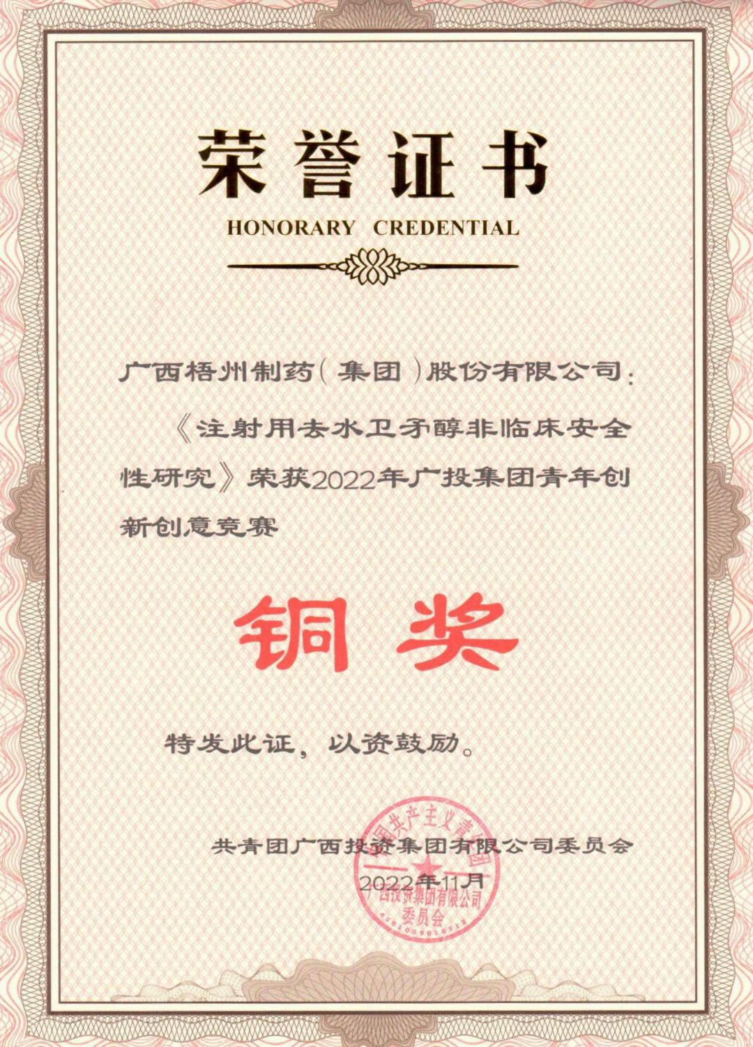 近日,由梧州制藥質(zhì)量保證部組成的梧州制藥代表隊(duì)——“質(zhì)量衛(wèi)士”隊(duì),憑借項(xiàng)目《注射用去水衛(wèi)矛醇非臨床安全性研究》獲得2022年廣投集團(tuán)青年創(chuàng)新創(chuàng)意競(jìng)賽銅獎(jiǎng)的表彰。本次競(jìng)賽共有16個(gè)項(xiàng)目最終入圍決賽,通過(guò)視頻會(huì)議的