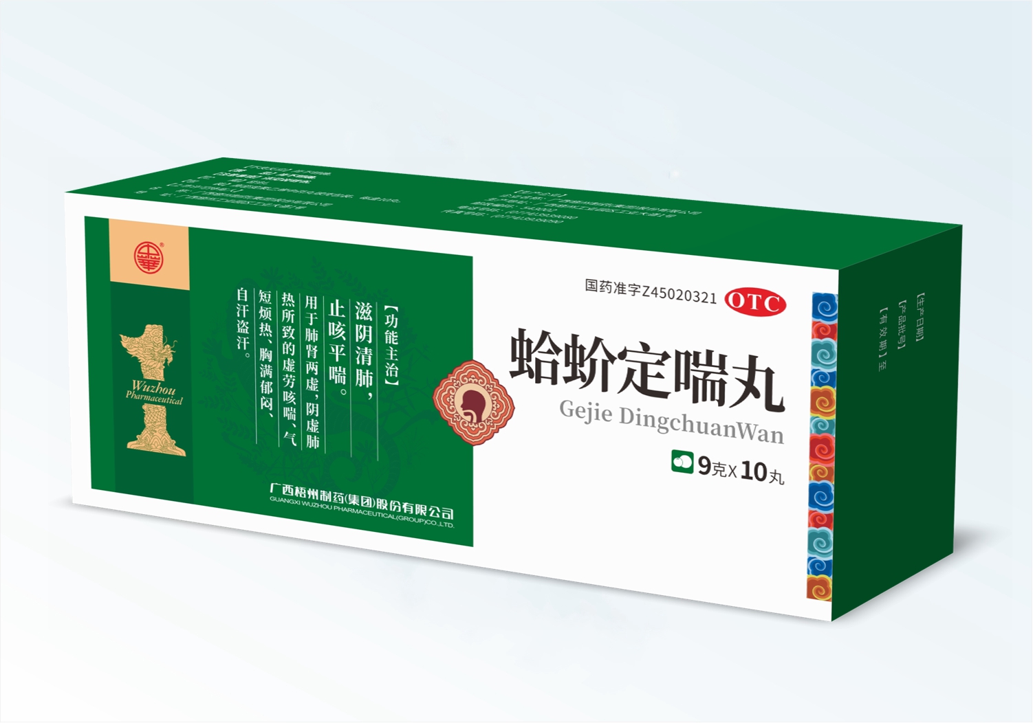 【藥品名稱】通用名稱:蛤蚧定喘丸漢語拼音:Gejie DingchuanWan【成份】蛤蚧、瓜萎子、紫菀、麻黃、醋鱉甲、黃苓、甘草、麥冬、黃連、百合、炒紫蘇子石膏、炒苦杏仁、煅石膏。輔料為蜂蜜?!拘誀睢勘酒窞楹诤稚拇竺?/p>